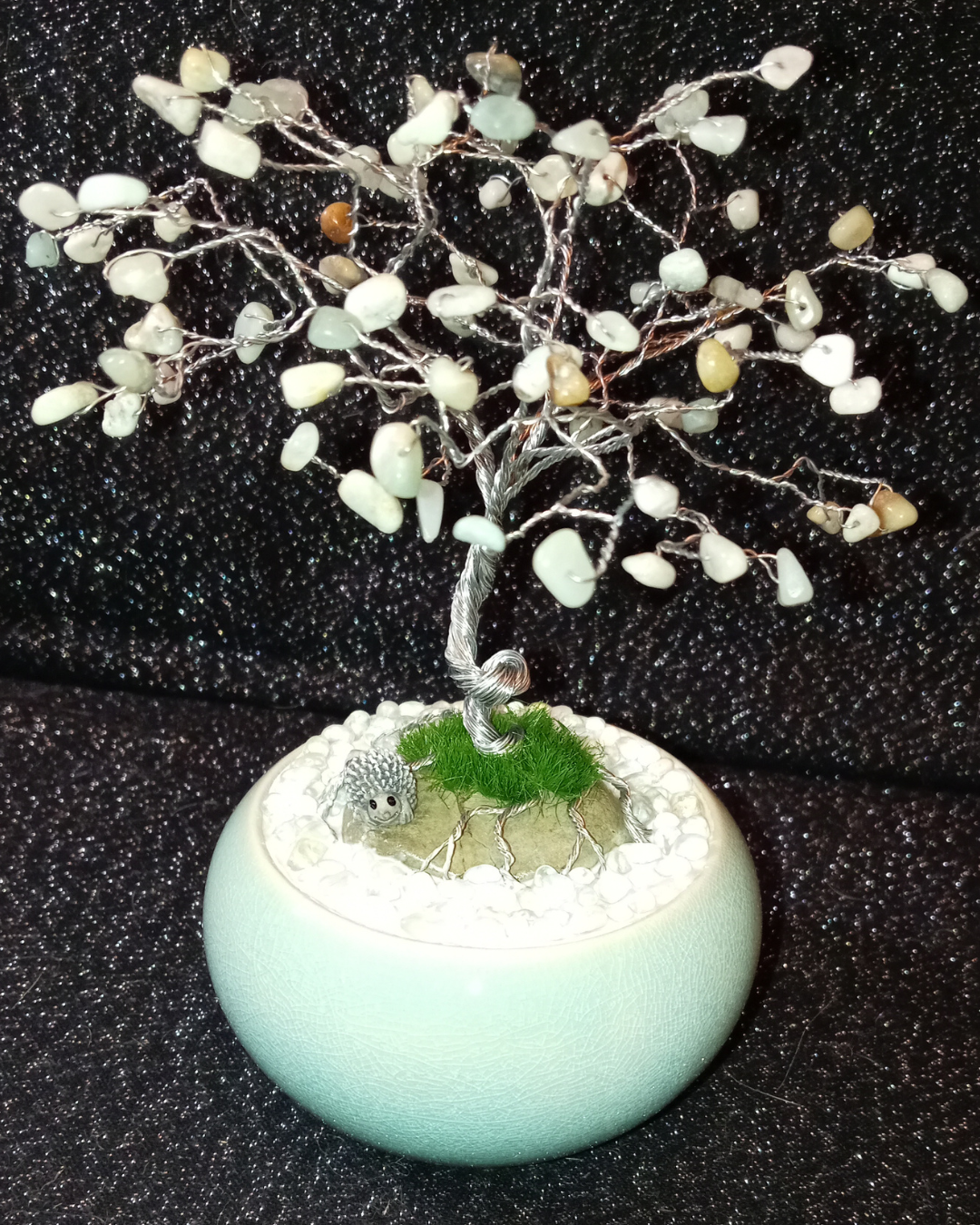 Arbre déco Jacaranda perles en Amazonite (Cat. A) sur Pierre brute avec un hérisson et Pot en céramique bleu clair (pièce unique)
