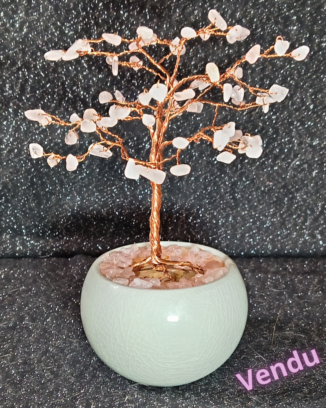 Arbre de vie déco en perles de Quartz rose (Cat. A) dans un Pot en céramique émaillée vert amande (pièce unique)