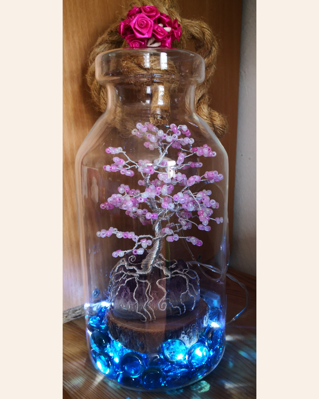 Arbre déco Bonsaï Sakura perles en verre rose sur cœur d’Améthyste avec éclairage dans un bocal en verre (pièce unique)