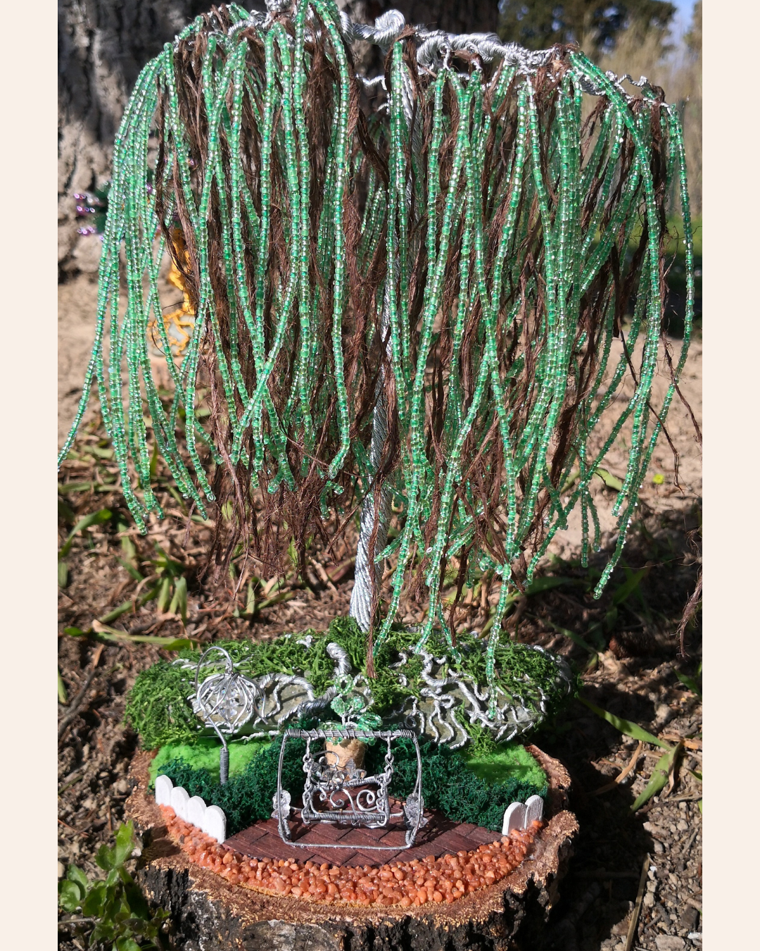 Ces arbres sont présentés dans un décor de bois, de pierre ou de galet naturel, tout en intégrant des matériaux de récupération. Cette approche permet de créer des œuvres à la fois élégantes et respectueuses de l’environnement, prônant une consommation durable et créative.