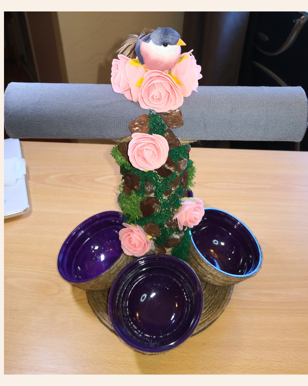 Porte-bracelets Artisanal avec roses en mousse, mousse végétale (Réf. MOUS1 et MOUS3), copeaux de bois (Réf. COPE), corde (réf. COJU4) et coupelles peintes en bleu indigo