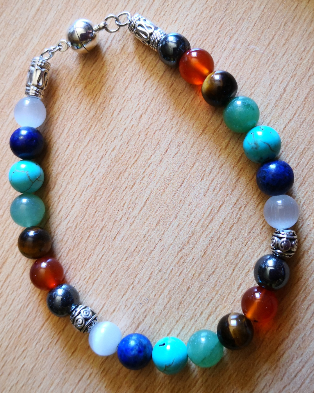 Le modèle de Bracelet ci-dessus a été créé avec des pierres d’Hématite, de Cornaline, d’Œil de Tigre, d’Aventurine, de Turquoise, de Lapis-lazuli et de Pierre de Lune agrémenté de perles tibétaines et d’entretoises – 55€