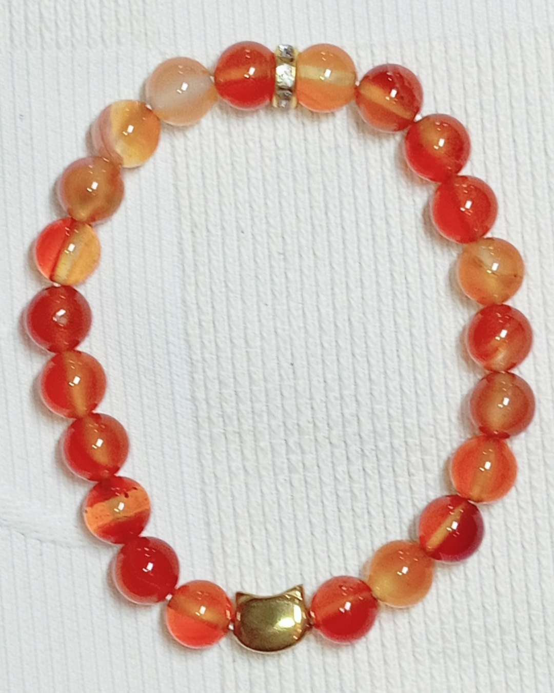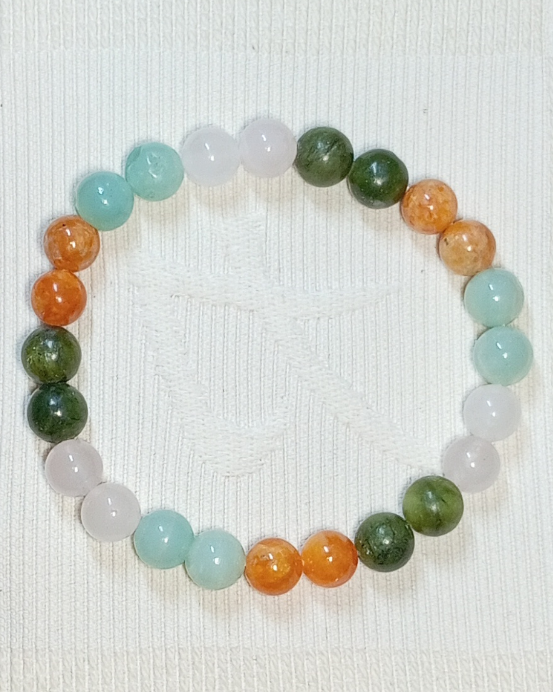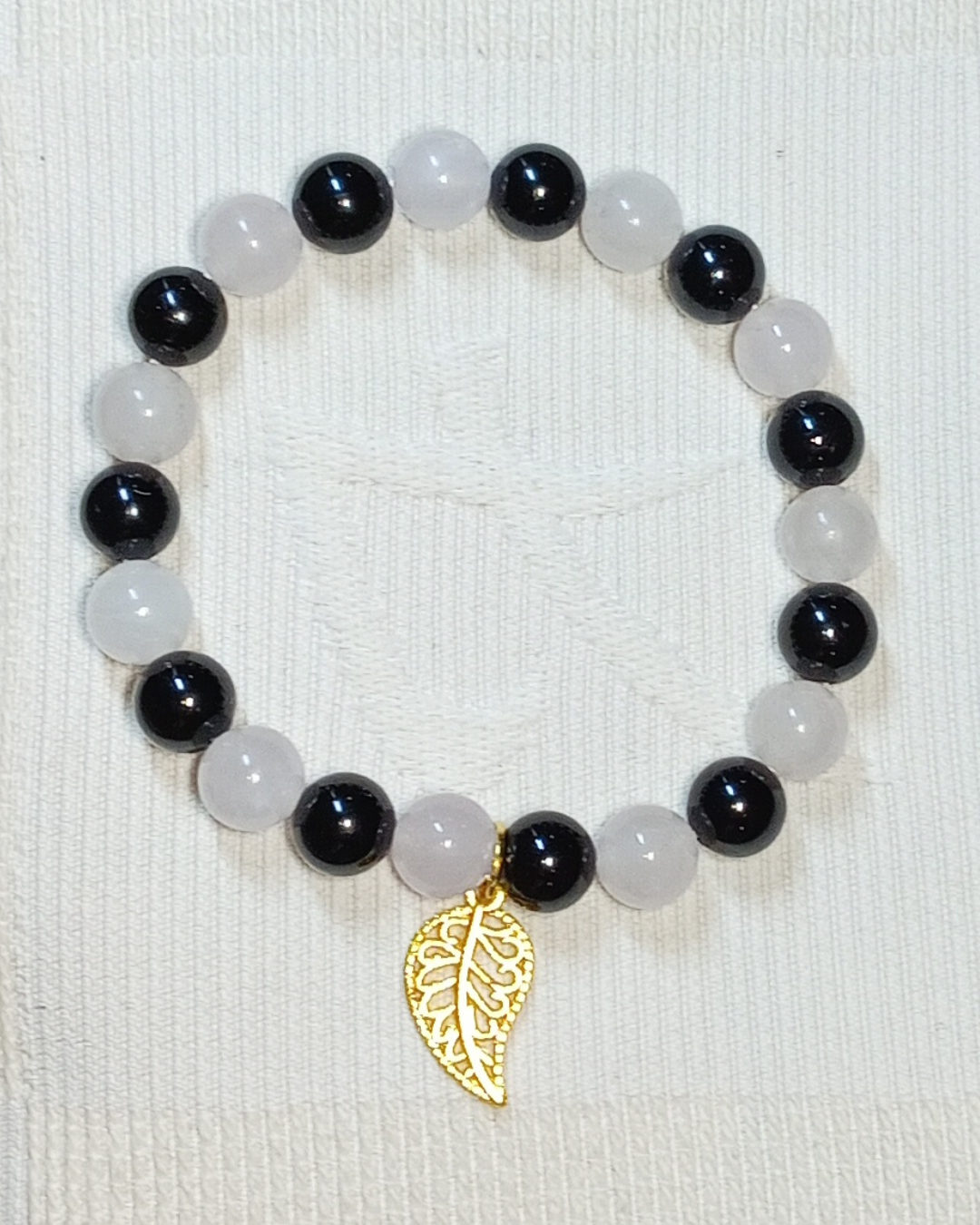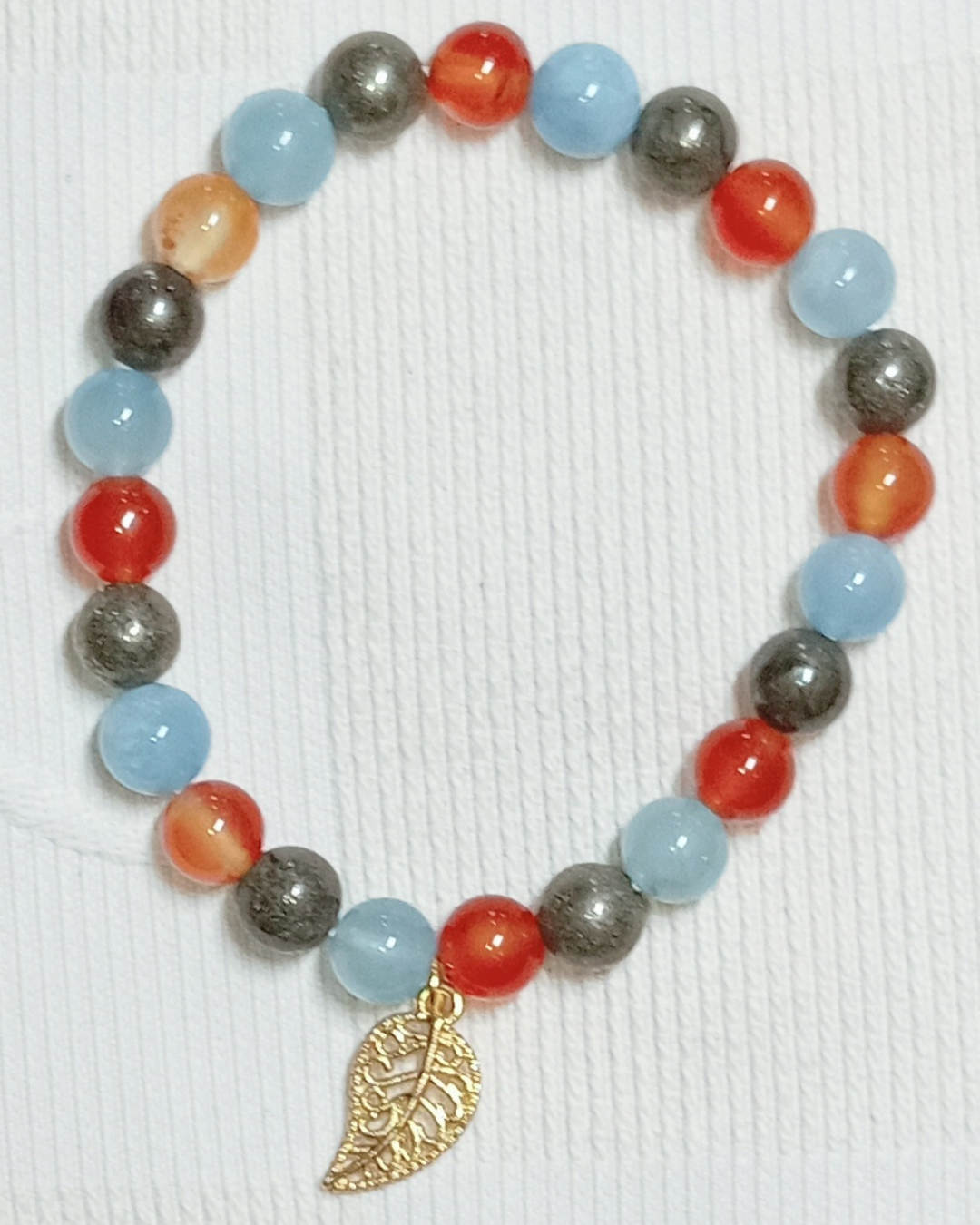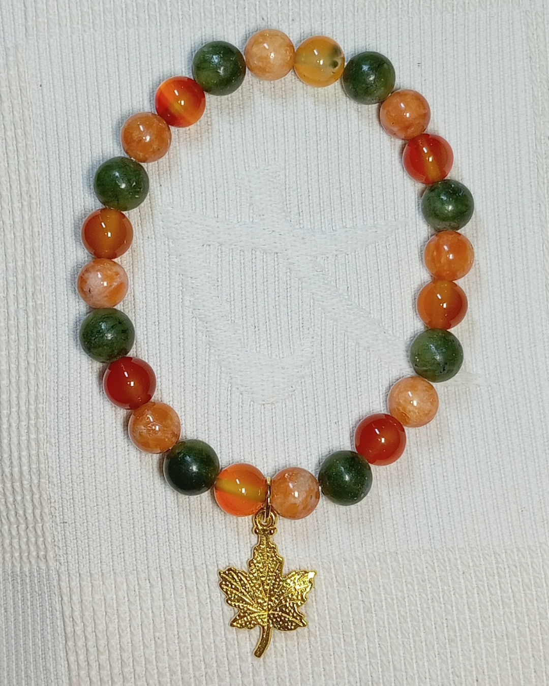 Jade, Cornaline Cat. A, Orange Calcite Cat. AA (8mm) et Breloque Feuille (Réf. BRFEB2)