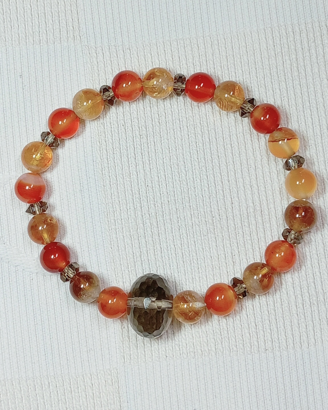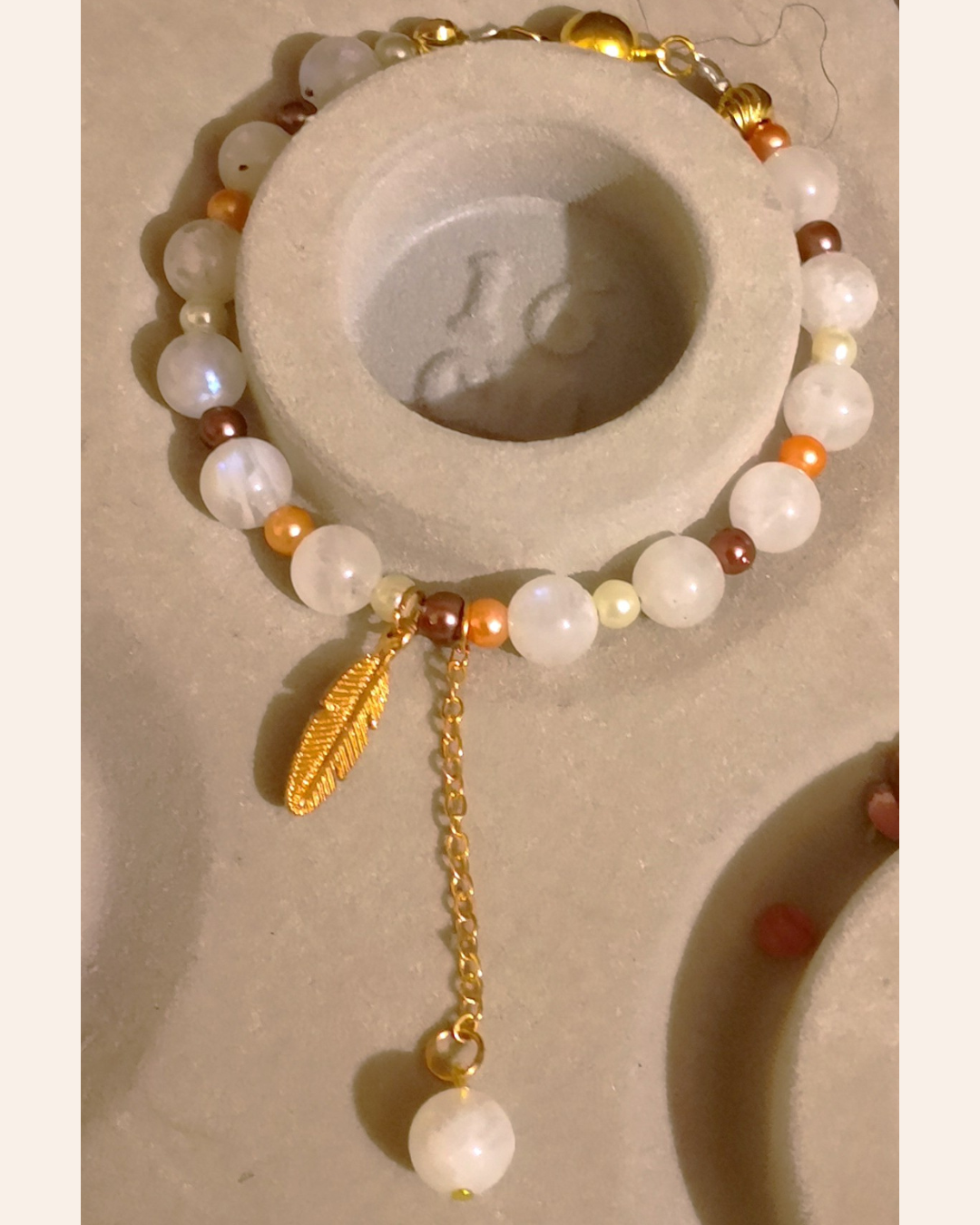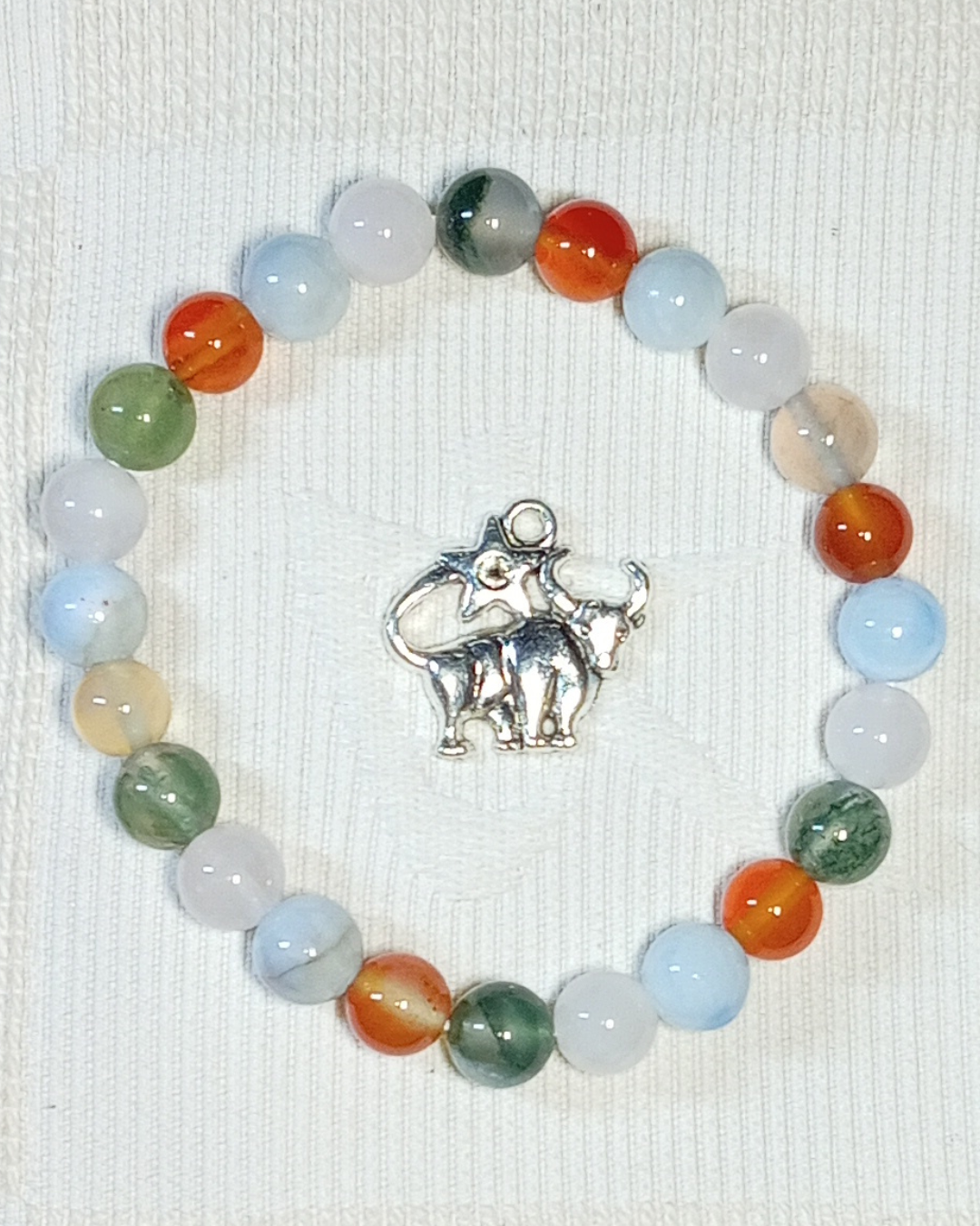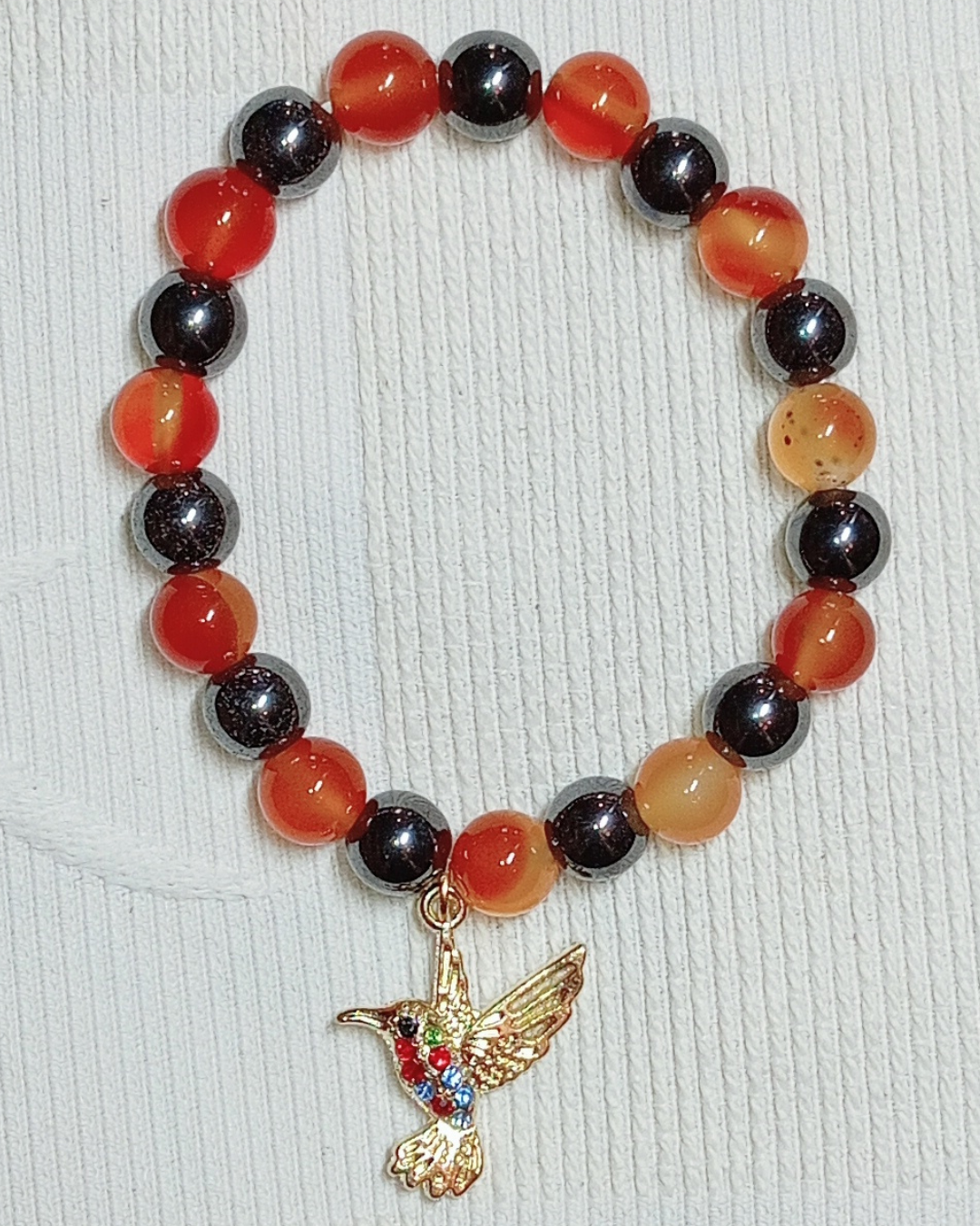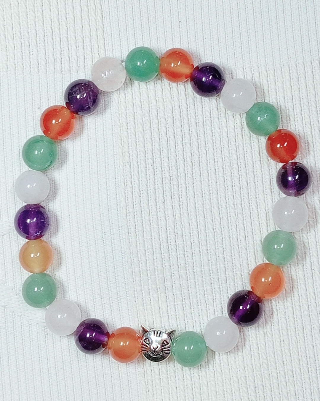 Jade, Cornaline Cat. A, Orange Calcite Cat. AA (8mm) et Breloque Feuille (Réf. BRFEB2)